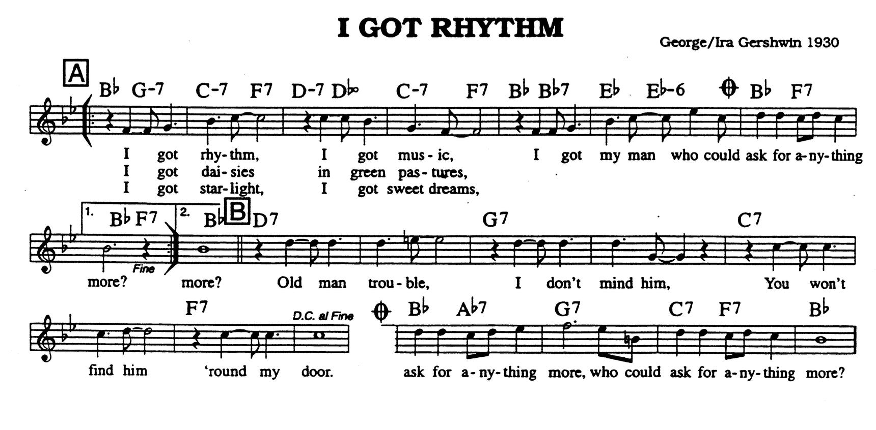 ‘Over the Rainbow’ is a classic example of this song form. Another is the jazz standard I got rhythm: the A section has a I-vi-ii-V chord progression and the B section moves through the circle of fourths, III7-VI7-II7-V7.