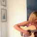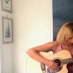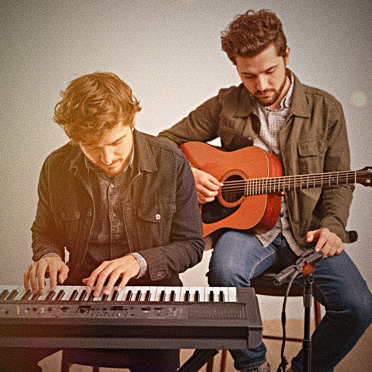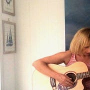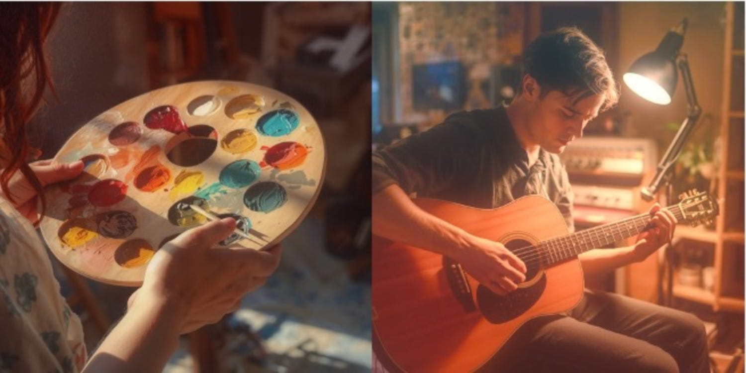 Artist paint palette, guitar player, note cards in the air and two songwriters images made via Canva